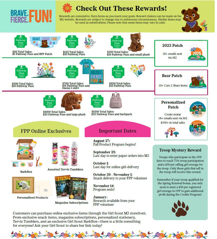 The GSNEO Fall Product Program gives troops the opportunity to offer snacks, magazines, and other items to raise proceeds that help fund their next adventure. Girls also learn important life skills like goal setting and money management, and they can earn fun rewards too! Girls can sell in person to their friends or family or digitally through the M2 secure online system for the program.